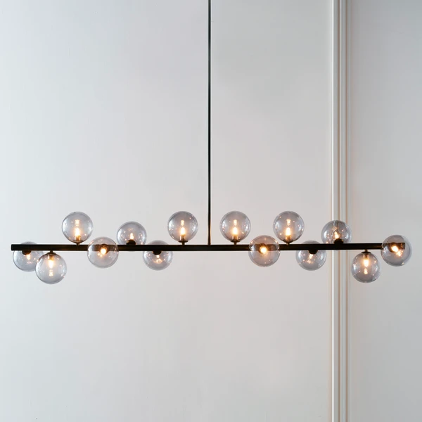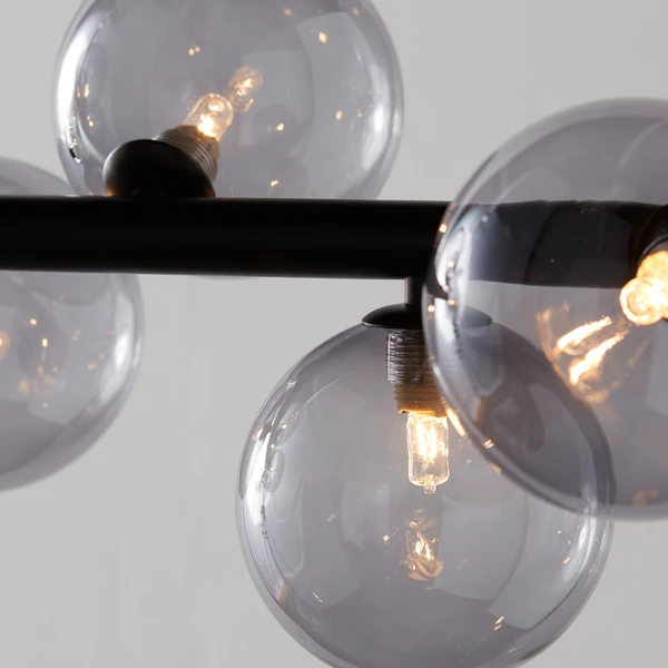 Radiating light in three directions, this chandelierâs linear blackened iron frame and smoky glass globe shades make an eye-catching statement over a dining table or kitchen island.