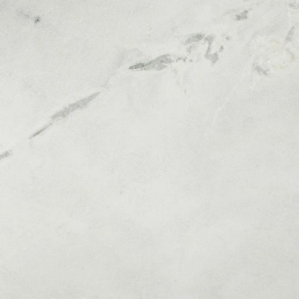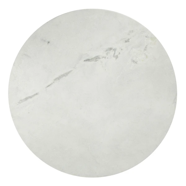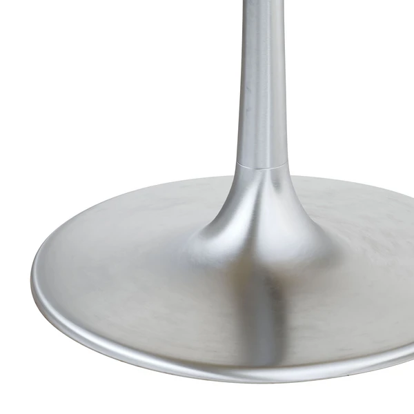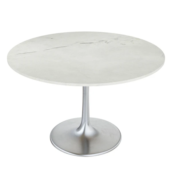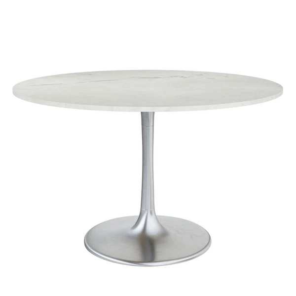 A modern dining table designed with a white marble top featuring unique grey veining and a tulip shaped base in a rich silver finish.