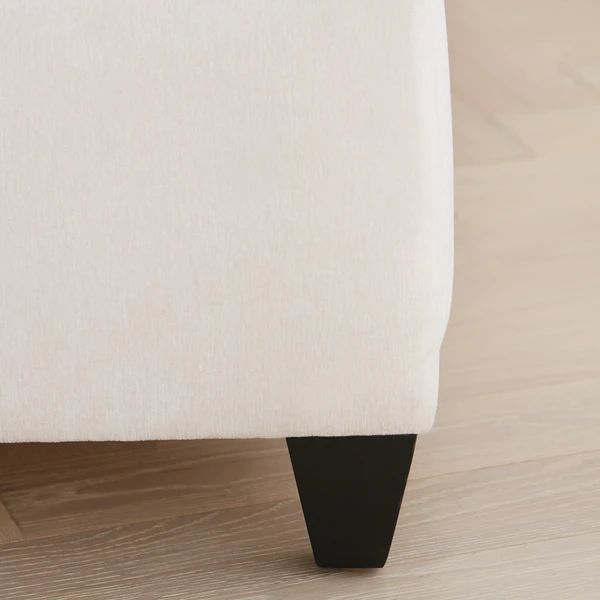 Sophistication and sweet dreams – an absolute must. The Blakely Bed keeps the whole room looking refined with features like subtle tufting on a towering headboard and a soft, fabric-wrapped footboard. Shown in Kenley Chenille Canvas.