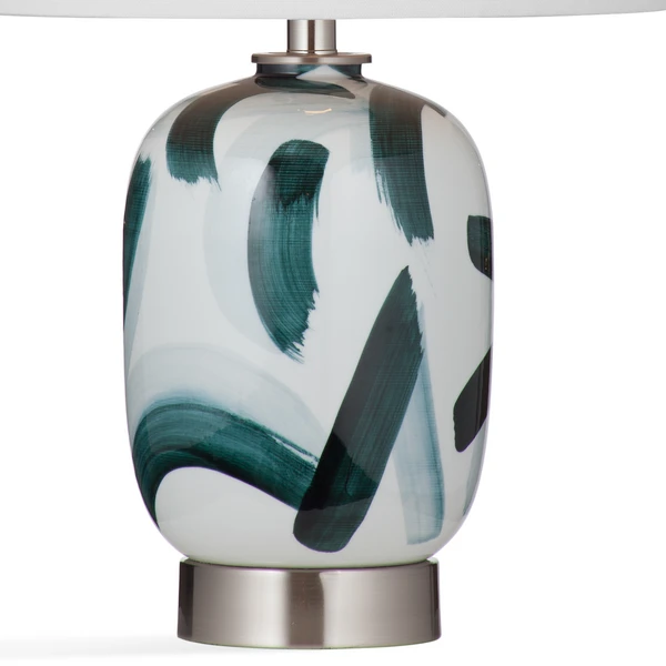 The Cale Table Lamp features a wide brush stroke design in a slate blue-green and white with silver accents and a white linen tapered shade