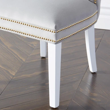 With its gentle curving silhouette, our sophisticated Charlotte Dining Chair effortlessly elevates the style of any room. Plush upholstery and hand-applied nail head details atop wooden legs make our Charlotte Dining Chair both refined and versatile. A pull ring matching the nailheads adorns the back of each chair. Shown in Bella Velvet Dove with golden nailheads.