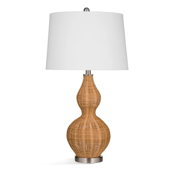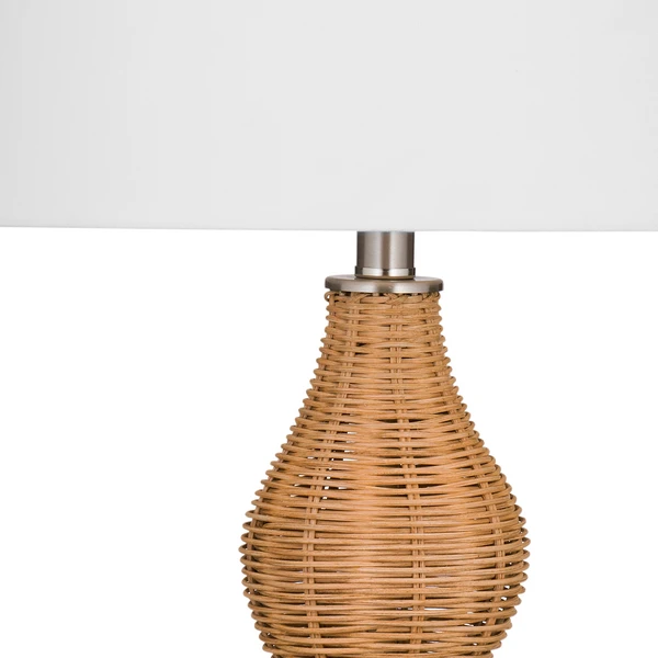 The Emeri Table Lamp is crafted of metal and natural rattan.