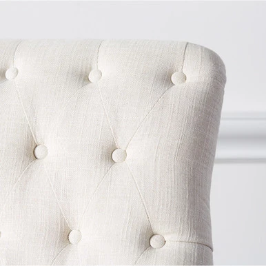 Our Jen Chair features a subtle curve and deep, button tufts that are applied by hand in a diamond pattern. Shown in Maxwell Linen Alpaca.