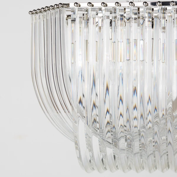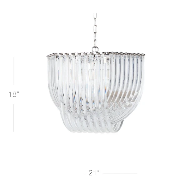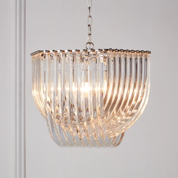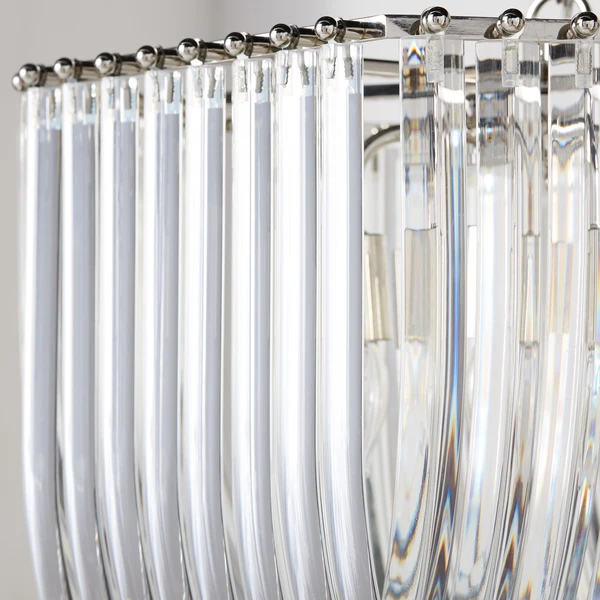 Cast warm ambient light throughout any space with our Laval six-light chandelier, featuring layers of crystal-clear curved glass in a deco-inspired frame.