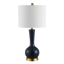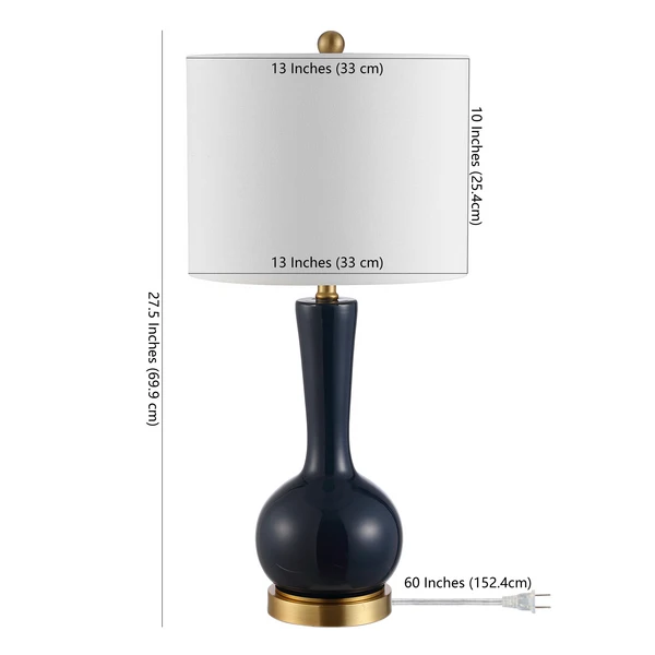 This Lucy Table Lamp elegantly modernizes classic pottery forms and elevates them for todayâs contemporary interiors. The glass silhouette, rich navy tone, and shining gold-finished base are balanced by a white drum shade, making it ideal in any dĂ©cor.