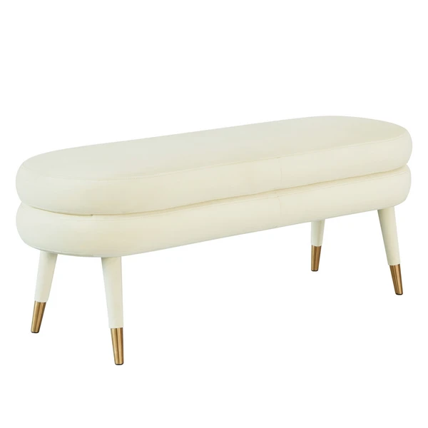 Upholstered in plush cream velvet and perched on gold-tipped cone legs, this bench brings glamorous style to any space. Generous padding ensures long-lasting comforts.