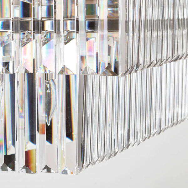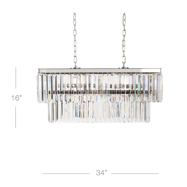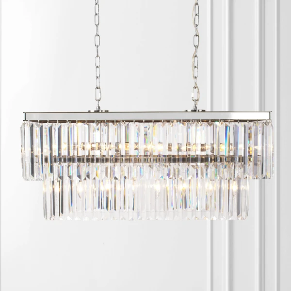 Finished in polished nickel, this linear chandelier is embellished with sparkling crystals for a glamorous touch.