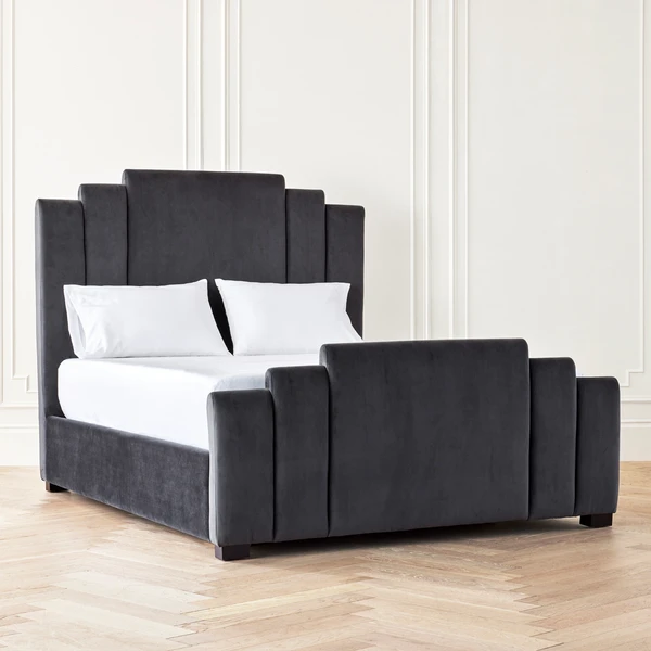 The Marlow Bed features dimensional elements and channel detailing, which create a dramatic effect. It is designed to make a bold statement, with its striking appearance and attention to detail. Shown in Royale Plush Velvet Gunmetal.