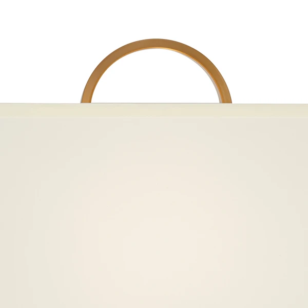 Artful indulgence features tempting design elements that transform this decadent floor lamp. Embrace a modern light source with an open concept oval warm gold finish metal frame and round base, a marble cylinder accent and dual framed disks that stand out to be noticed. A rectangular shantung box shade offers proportionality.