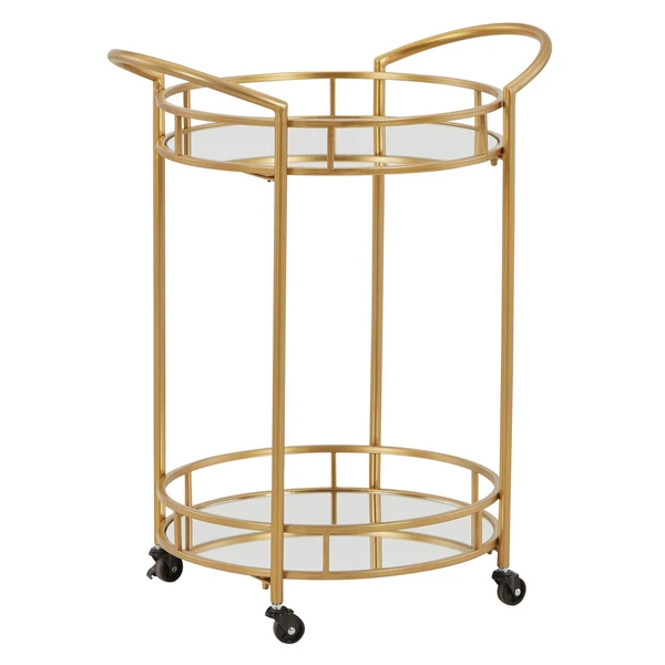 It’s beautiful bold blend of gold tone metal and mirrored glass shelves will heighten your home’s aesthetic. The Murray bar car is a striking choice for your kitchen or entryway, with locking casters that allows you to serve anywhere in style. This item is available online only and ships direct to customer.