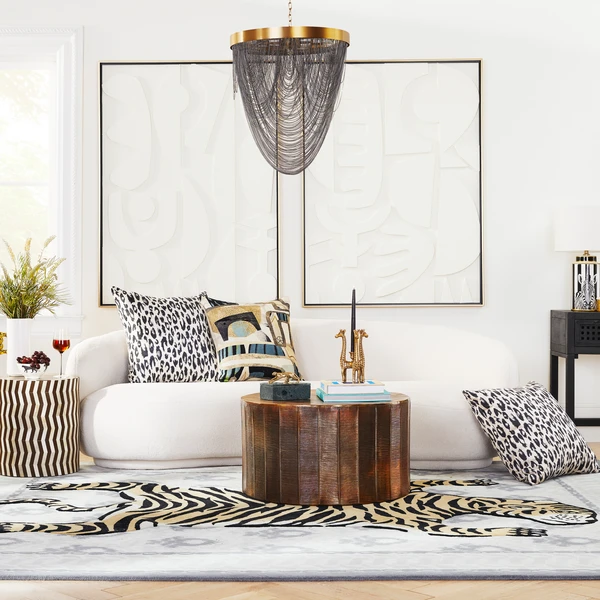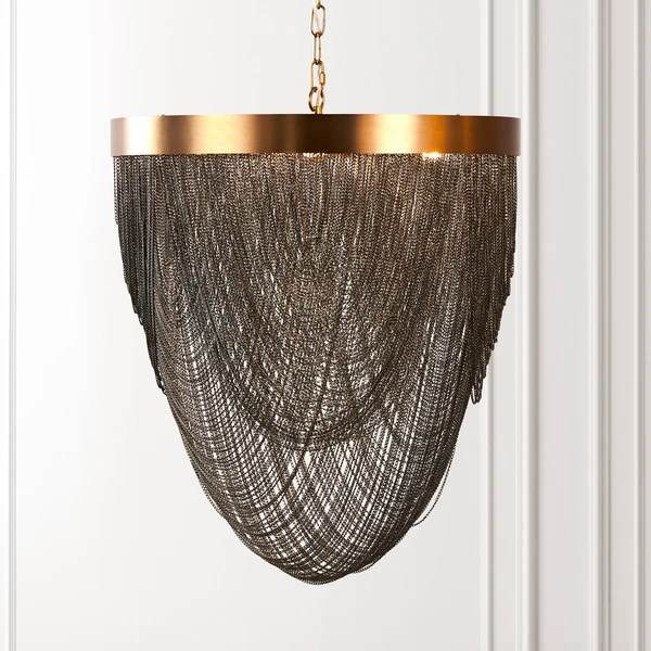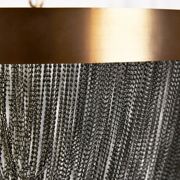 Designed by Nikki Chu, the Alaya Chandelier brings the drama with layers of fine black chain hanging from a brushed brass frame.