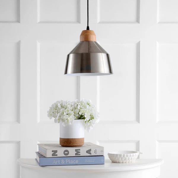 Bring industrial-chic style to any bedroom, living room, or kitchen with this modern pendant. Crafted with a shining nickel shade and contrasting light brown wood accents, its sleek design adds just the right amount of contemporary flair.