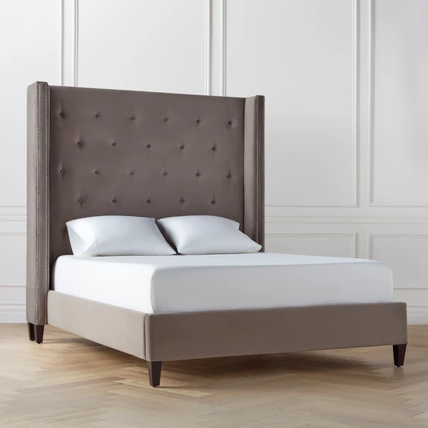 Our Porter collection elevates the comforts of your bedroom. The clean lines and modern details make a statement in the room. Shown in Bella Velvet Otter with bright nickel nailheads.
