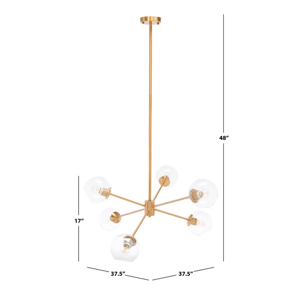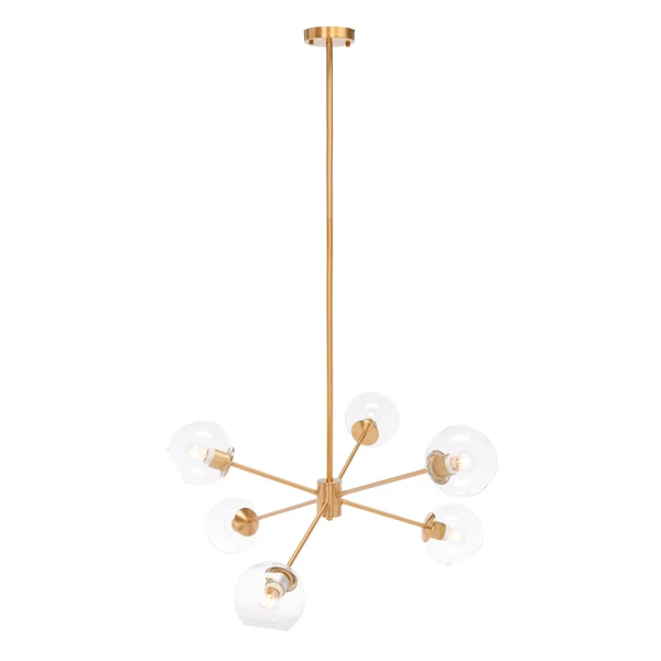 A modern take on Sputnik-style lighting, this chandelier is a showstopper. It’âs sleek gold metal frame shines from the glow of its uniquely shaped clear glass shades, casting a fashion-forward gleam in any room.