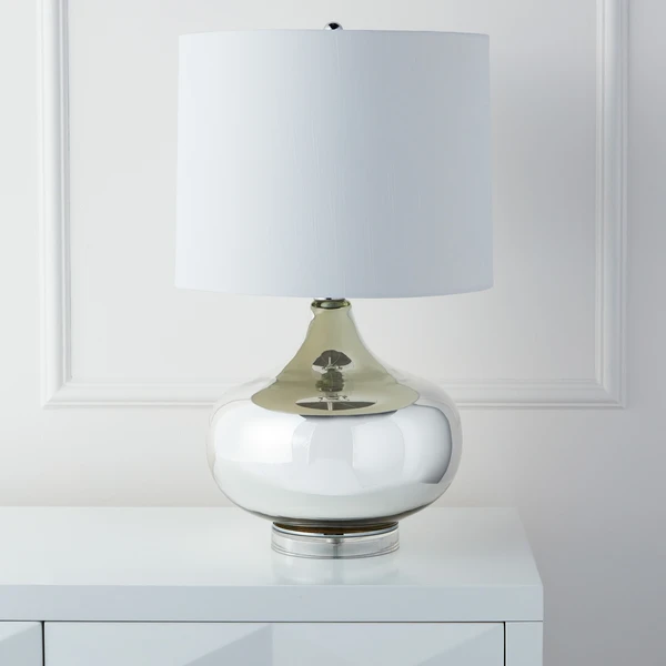 Our spectacular Sabrina Table Lamp combines simple contemporary shapes and a sparkling silver finish to create stylish lighting for your home. The sleek rounded base is crafted of Silver mirrored glass and sits on a clear acrylic platform, while the white fabric cylindrical shade adds to the modern appeal.