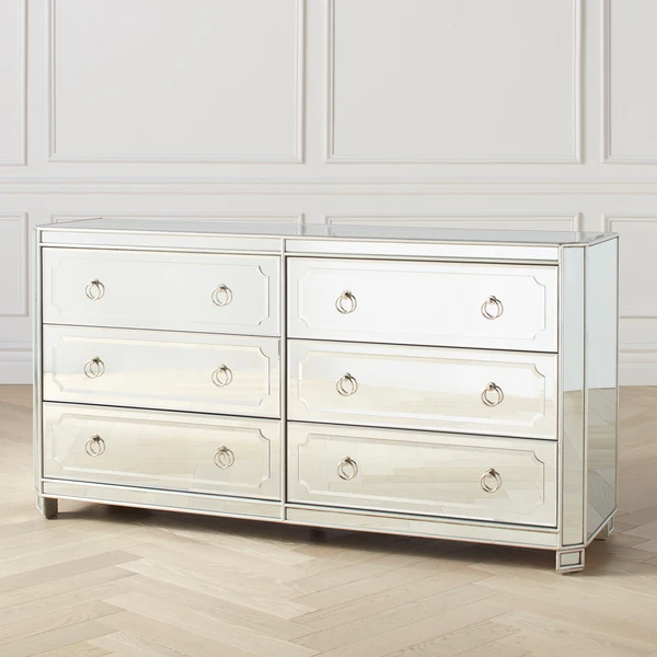 Designed with clean lines and beveled mirror paneling, our Simplicity Collection delivers shimmering style to the bedroom. Hand-applied silver-leaf trim and polished nickel hardware finish off the glamorous look.