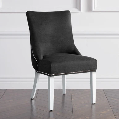 Featuring diamond shaped button tufting around the back, our Versailles chair elevate the style of any room. Shown in Royale Plush Velvet Gunmetal with bright nickel nailheads.