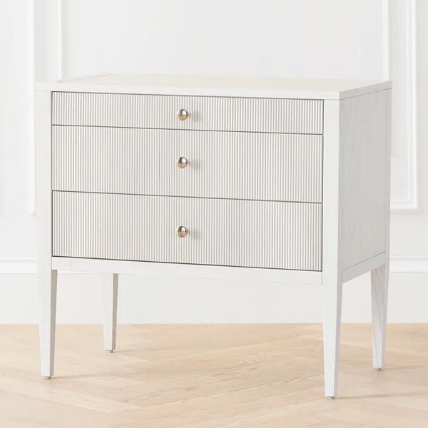 Elevate the style of your bedroom with our Viola nightstand. Featuring a sleek, modern silhouette and unique reeded drawer fronts, this nightstand is sure to catch your eye. The bone white finish and brass hardware add a touch of luxury to the overall design.